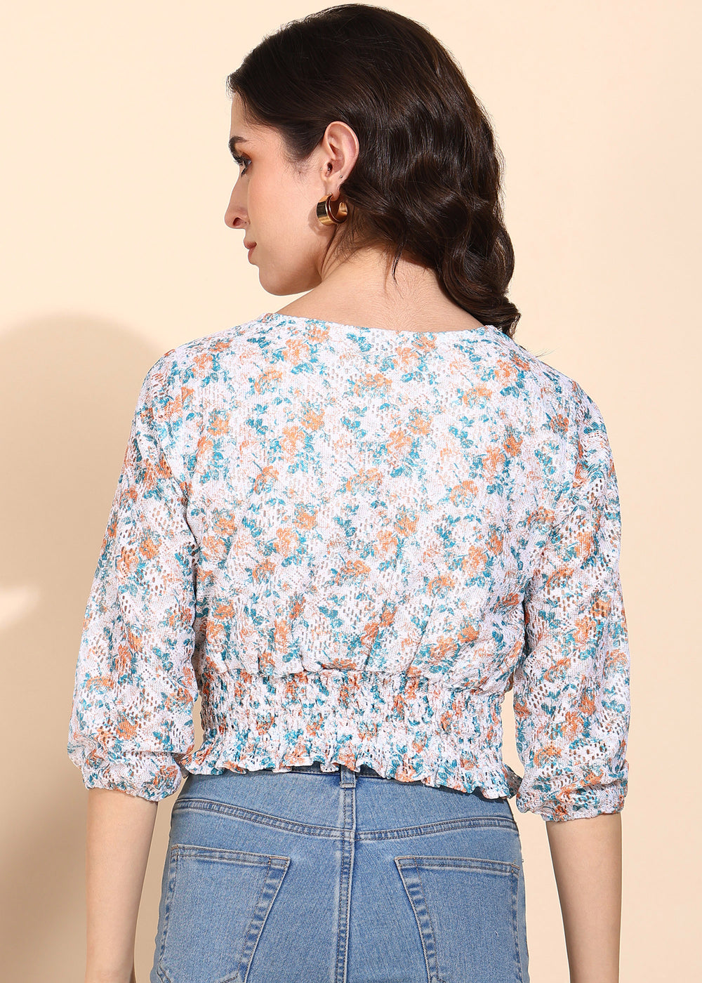 Pattern: All-over floral print in apricot orange and teal tones