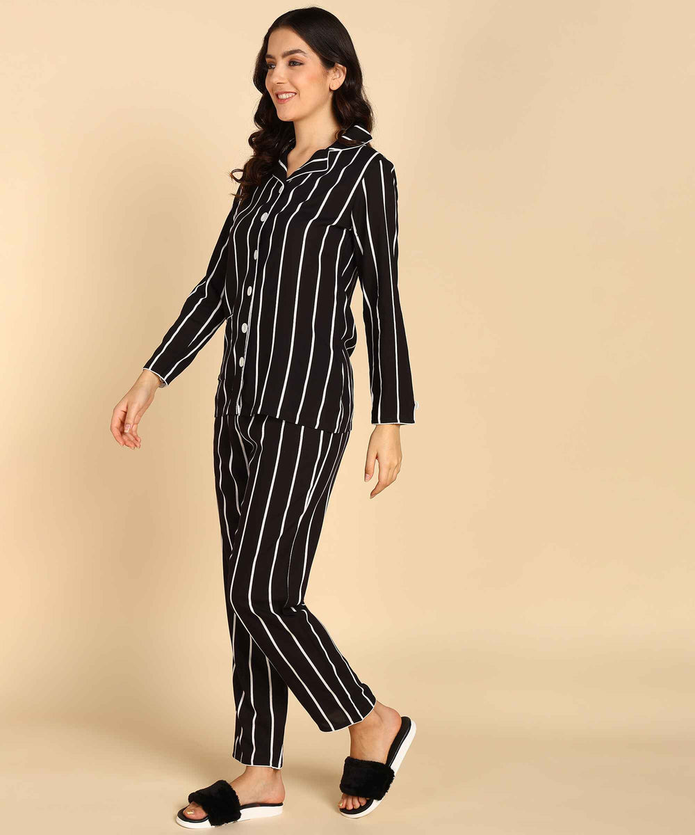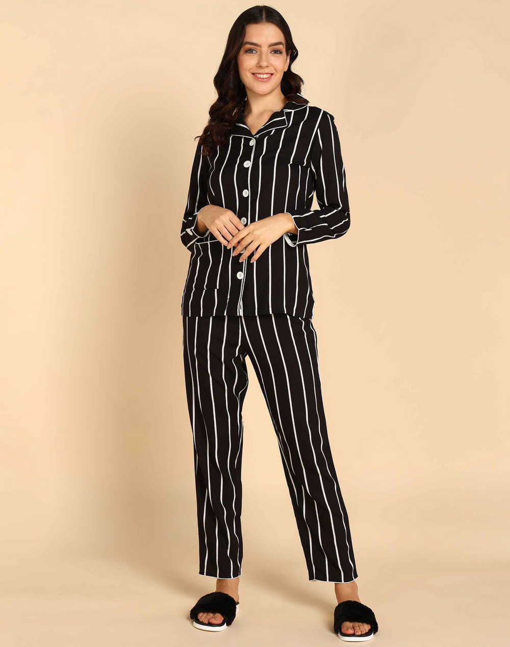 Sleek, striking, and unapologetically stylish—"Midnight Lines" is your dose of drama after dark. With bold white stripes on classic black and a tailored silhouette, this one's made for fashion-first lounging (and maybe a selfie or two).