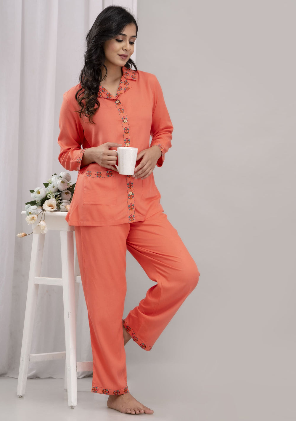 Bright, breezy, and made to turn lounging into a style statement—"Coral Charm" is all about effortless flair. With its poppy hue and delicate printed accents on the placket, cuffs, pockets, and hem, this set is your ticket to laid-back glam.