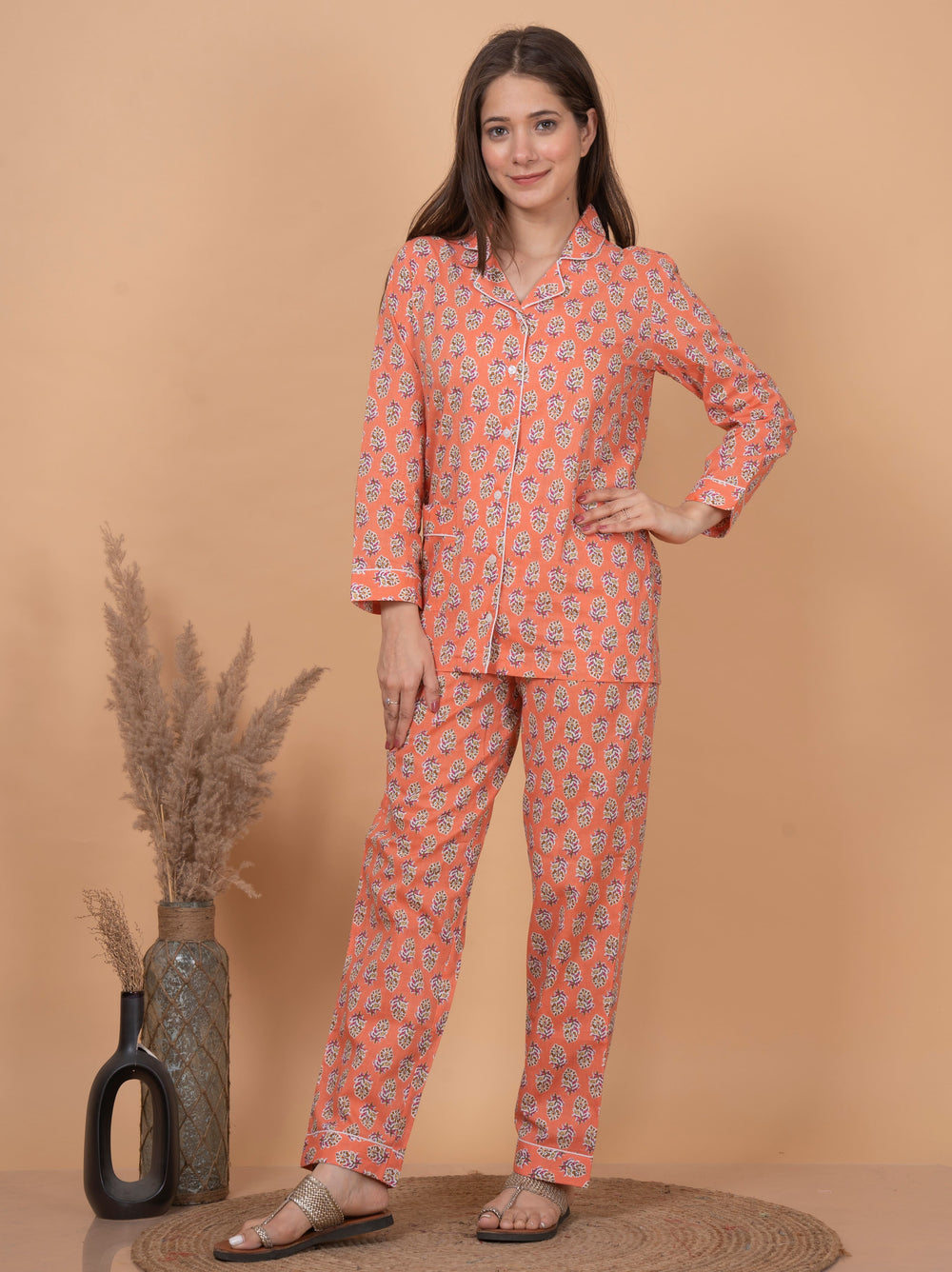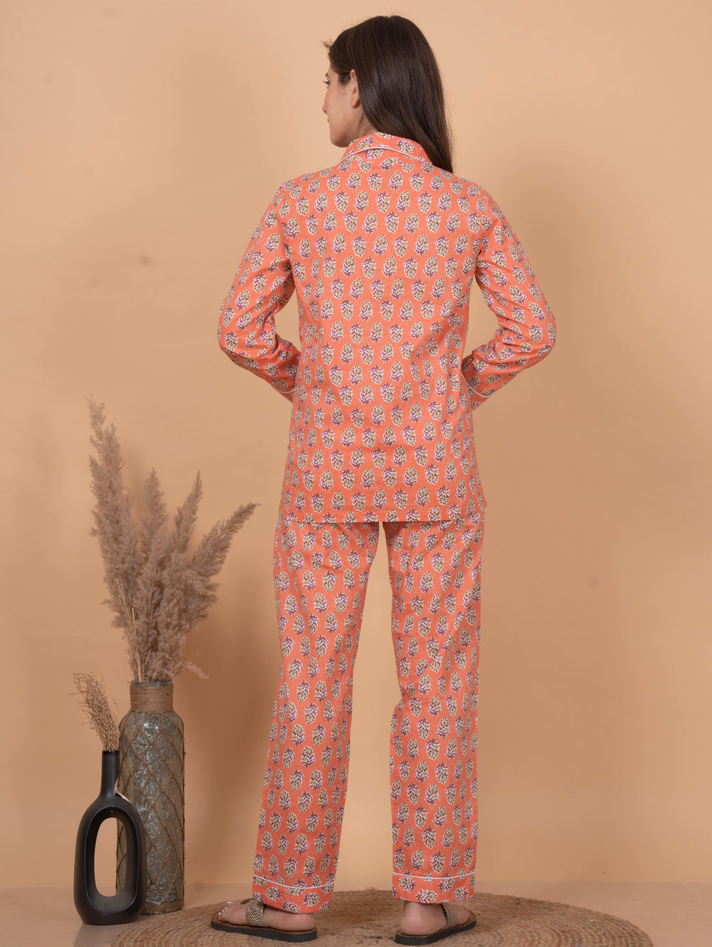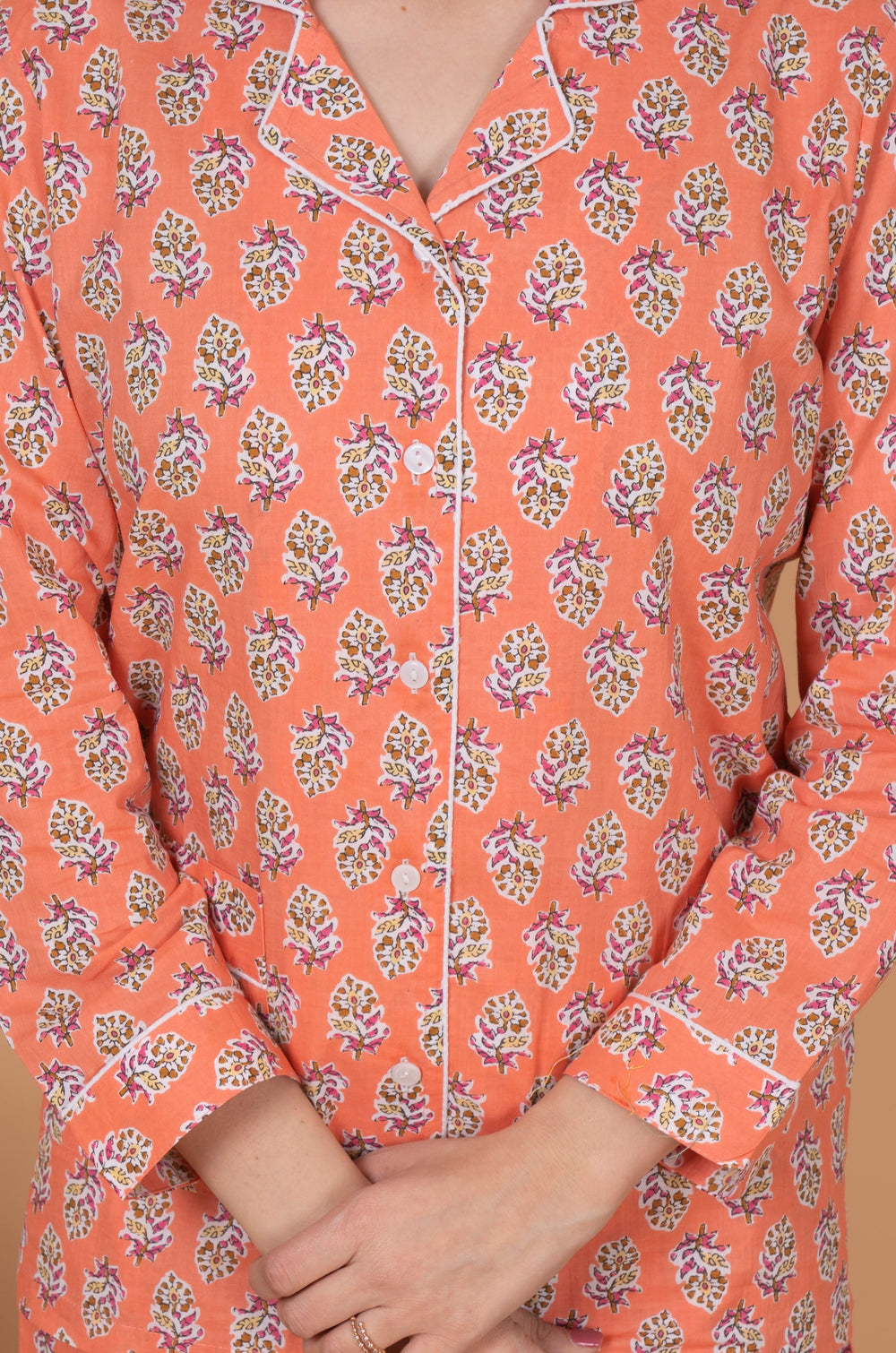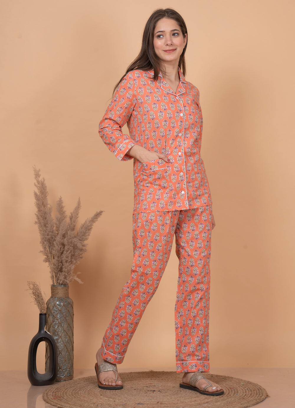 Cheerful, comfy, and cute as ever—the "Peachy Paisley" night suit brings sunshine to your nighttime ritual. With lively block-style prints on a peachy base and piping to match, this one’s made for feel-good lounging and early morning glow-ups.