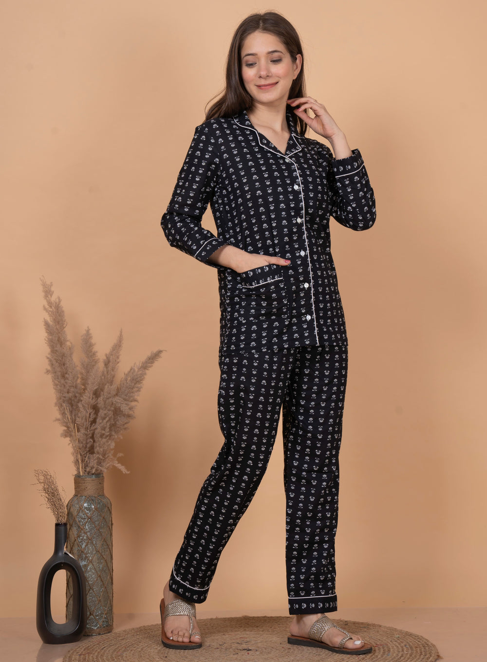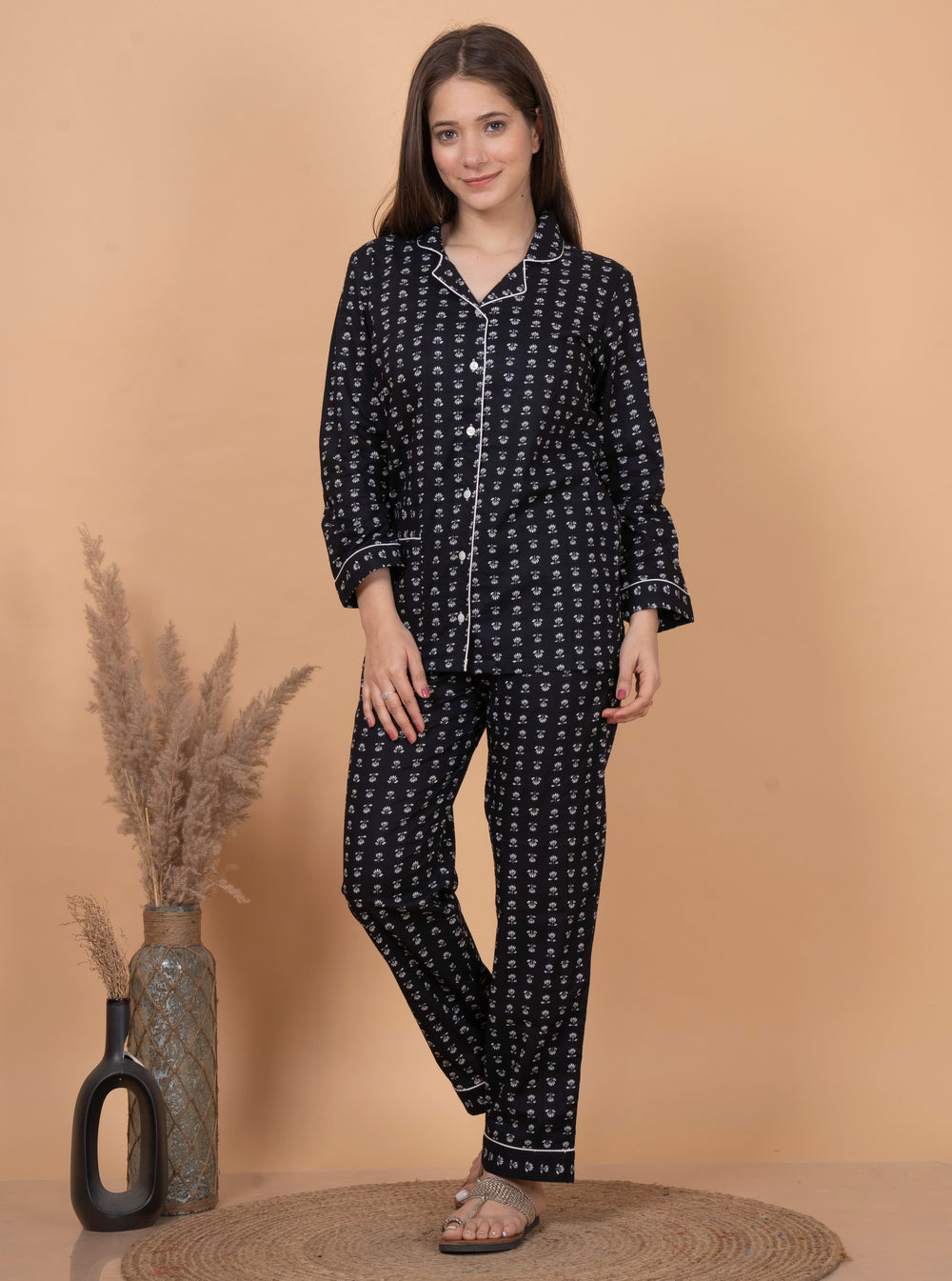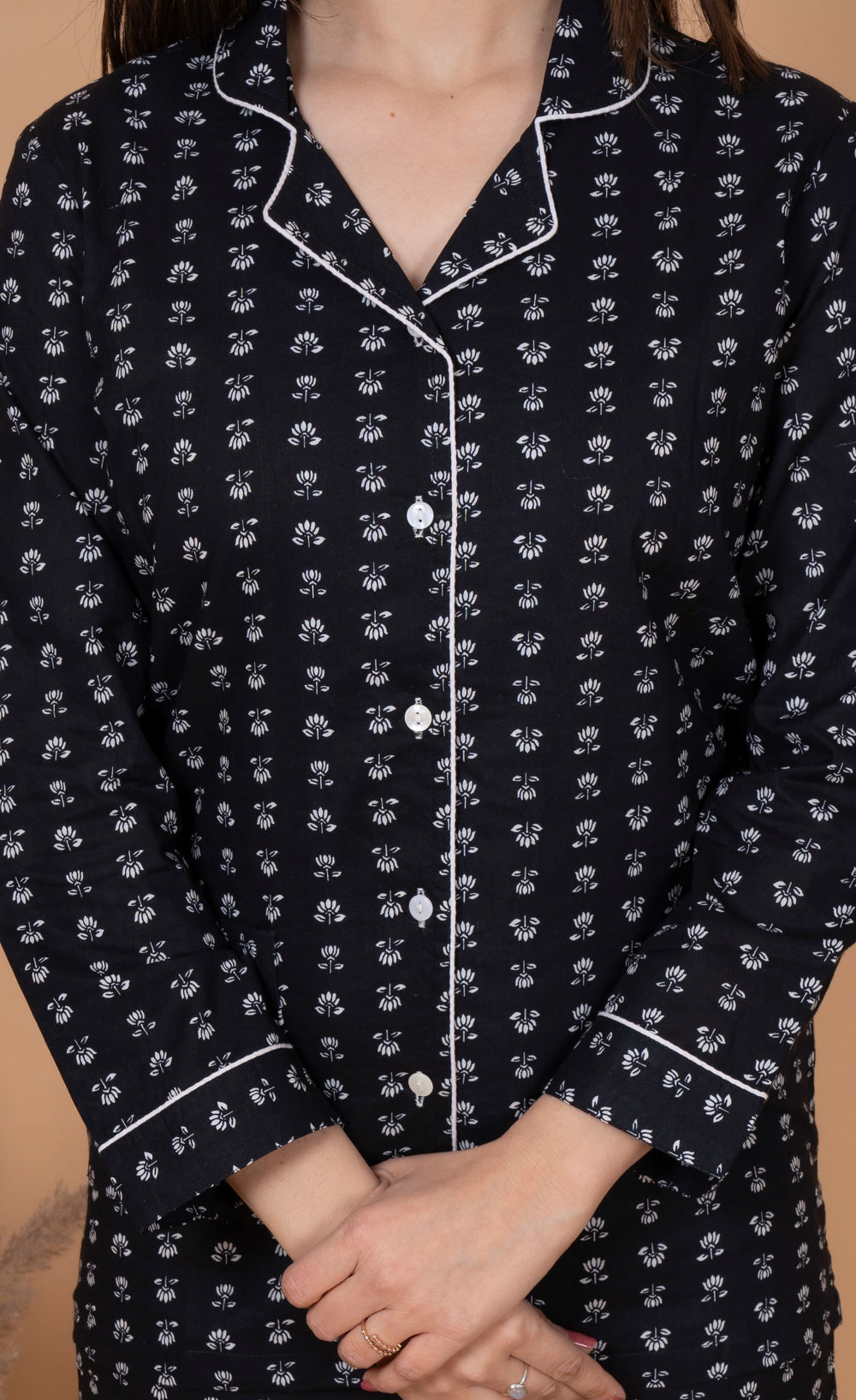 Made for moonlit musings and coffee-fueled mornings—the "Midnight Bloom" night suit is your perfect excuse to stay in just a little longer. With dainty white florals on a jet-black canvas and piping that pops, it’s cozy-chic at its best.