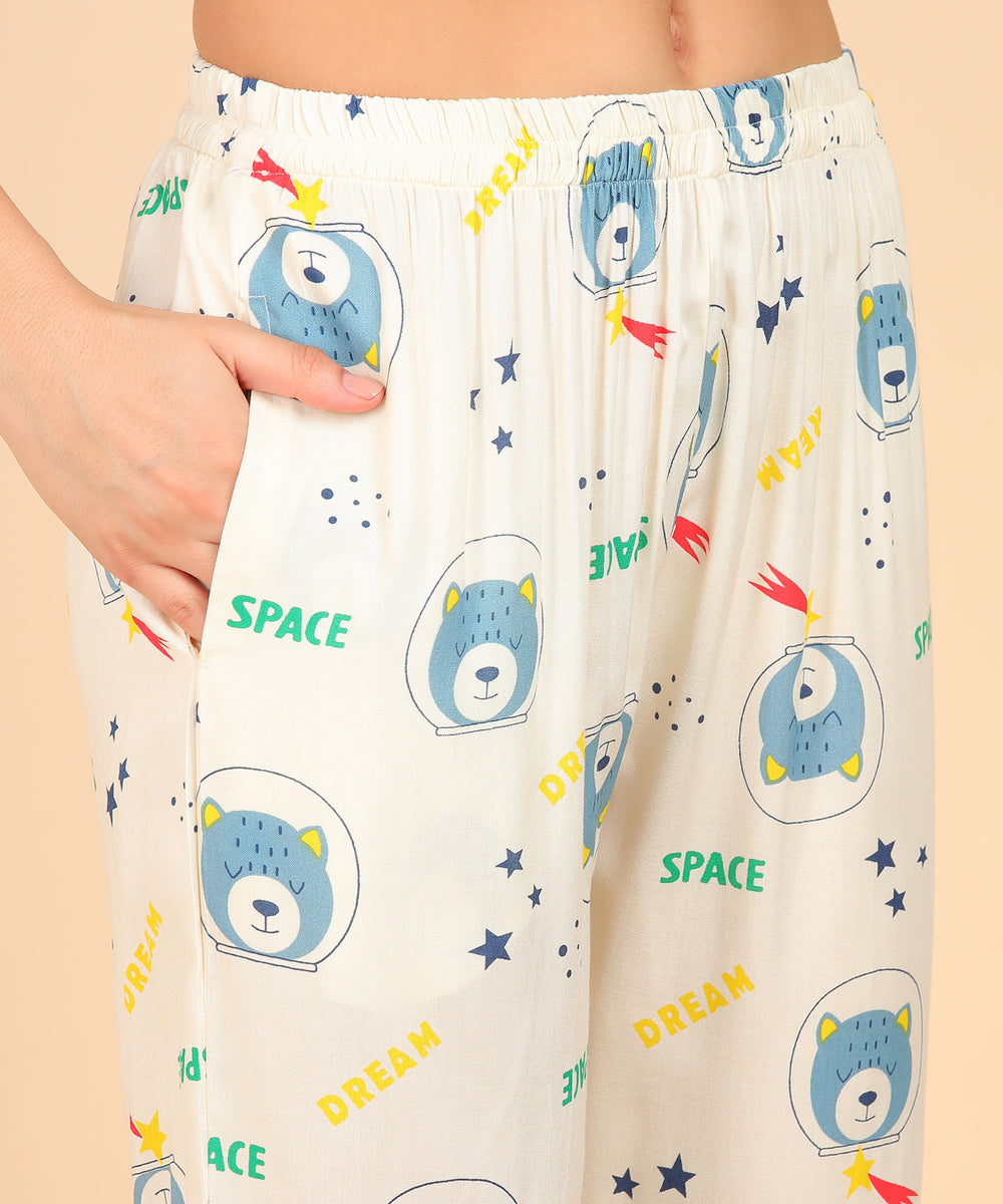 Pattern: All-over space-themed print with teddy faces, rockets, stars, and words like “SPACE” & “DREAM”
