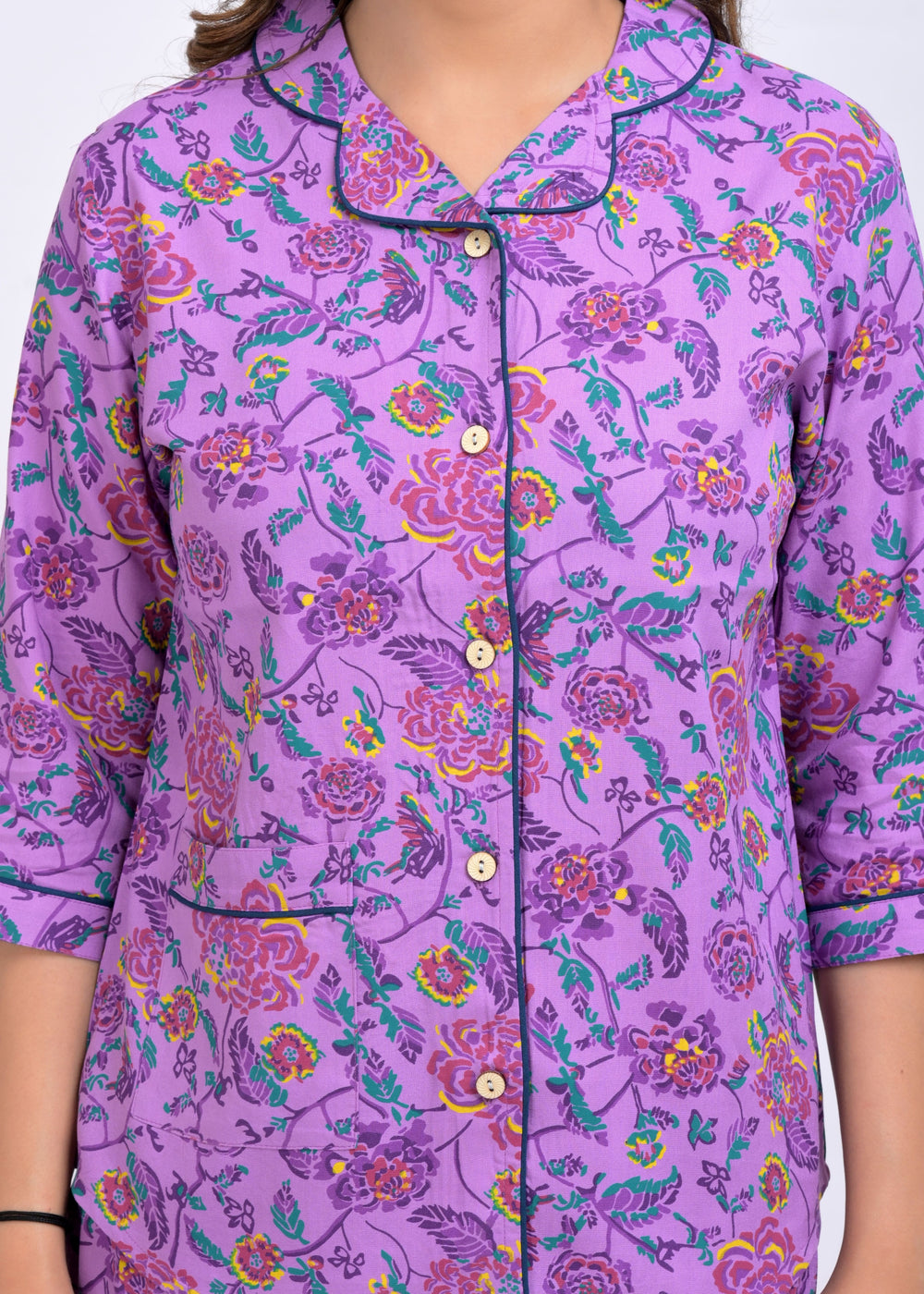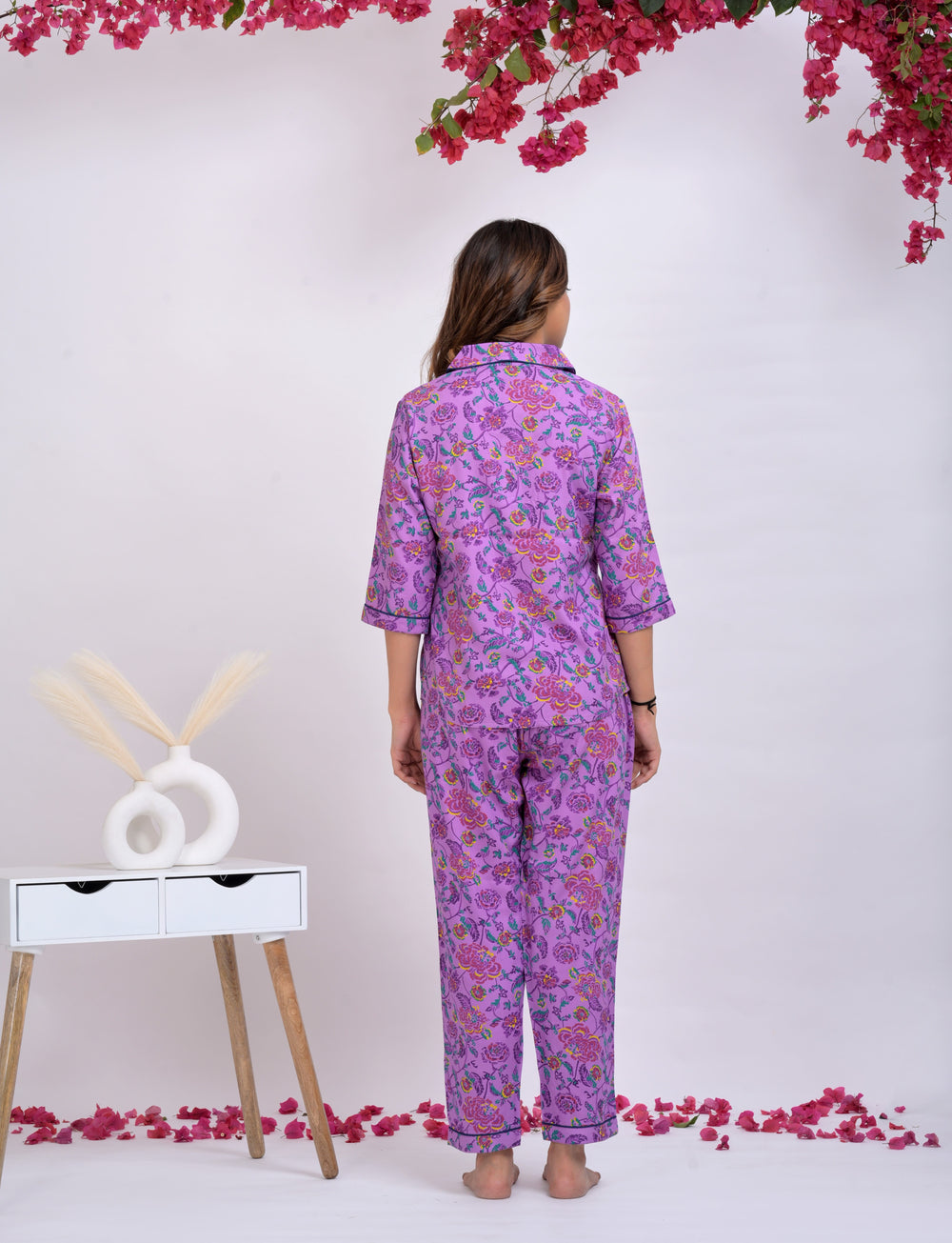 Bright, blooming, and oh-so-dreamy—"Bougainvillea Bloom" is your little garden getaway in nightwear form. With vibrant floral vines trailing across a lush lavender base, this one's made for bedtime bliss and morning magic.