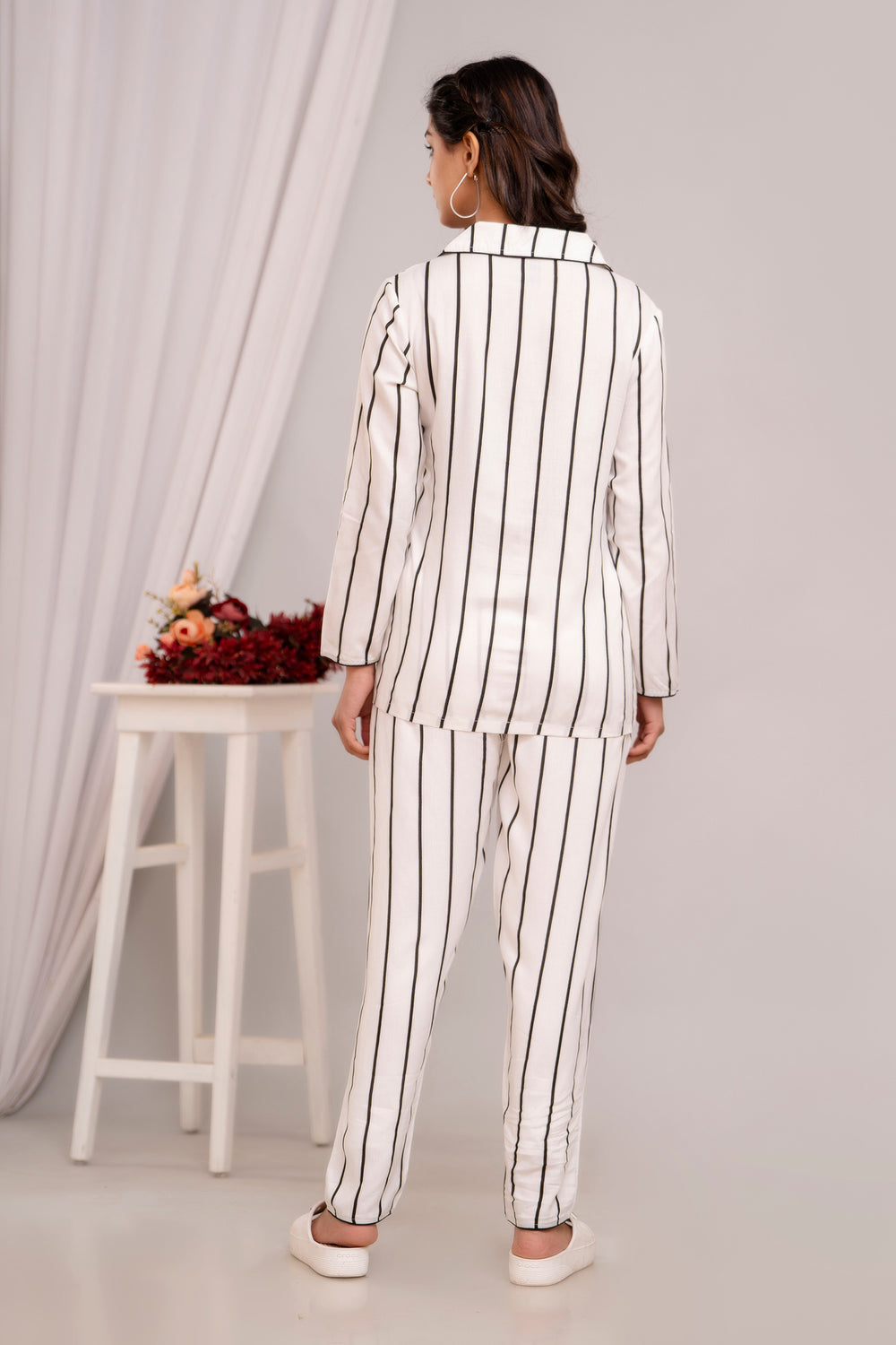 Pattern: Vertical black stripes on an off-white base for a timeless silhouette